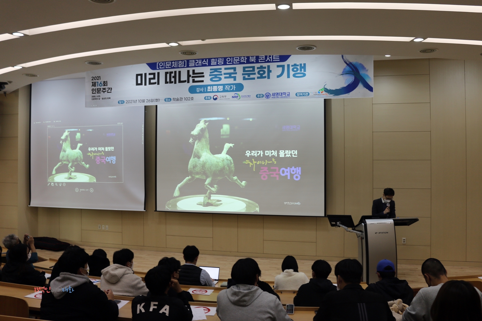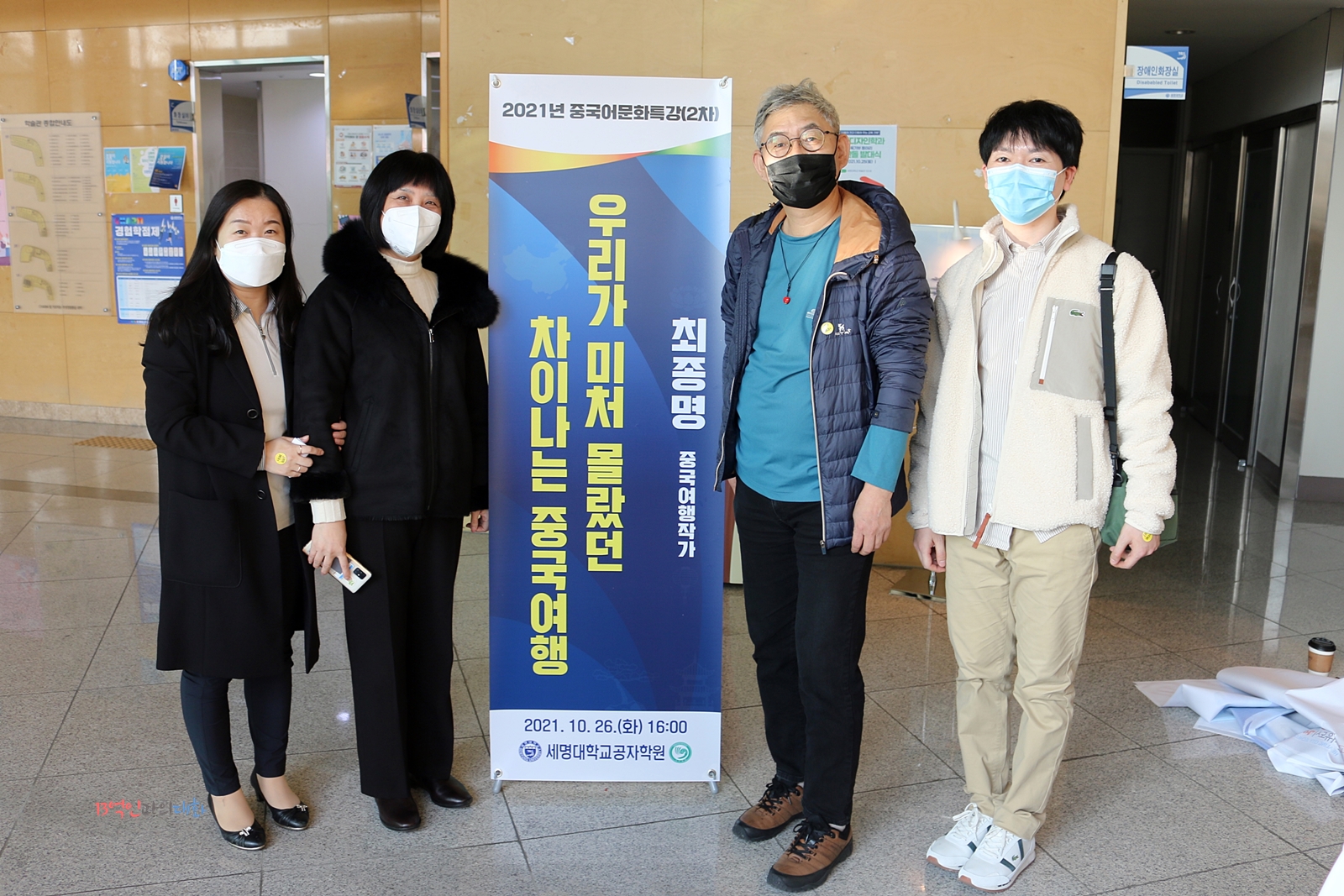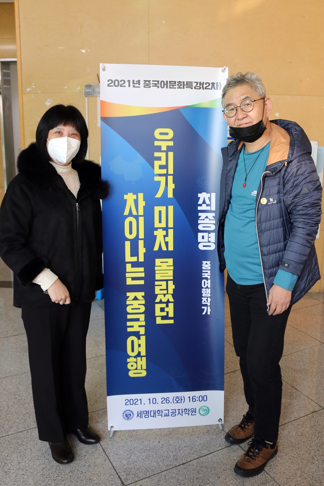 10월 26일 제천 세명대학교에서 열린 문화 특강. 공자학원 중국인 선생님이 찍은 사진입니다. 세명대학교는 장시江西· 난창南昌의 중의대학교와 자매결연을 맺고 있습니다. 난창에서 오신 중국인 선생님과 세명대학교 국제언어학부 교수님과 함께 인증 등. 옆으로 넓은 강의실이라 시선을 좌우로 살피며 강의를...