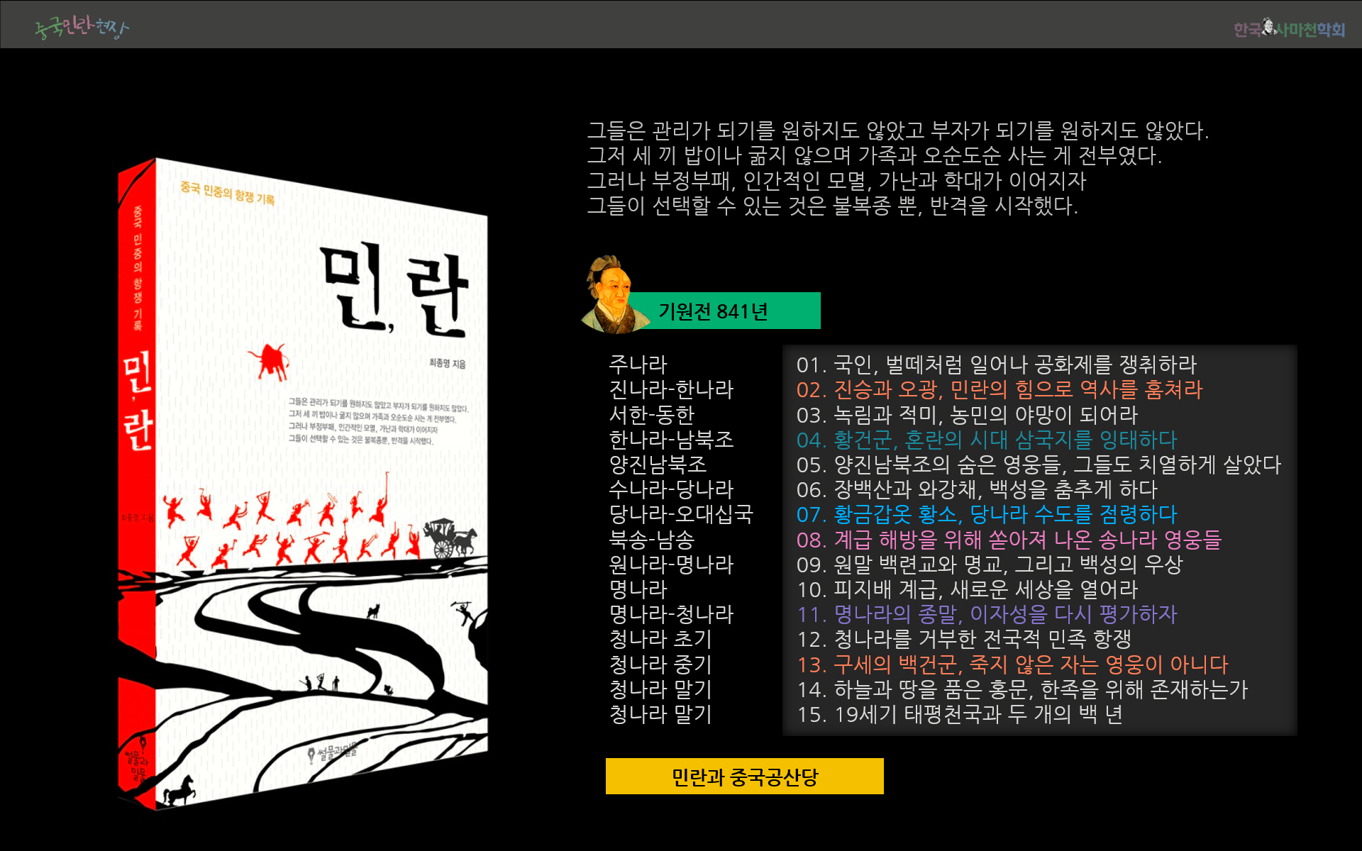 안산의 경기테크노파크에서 열린 한국사마천학회의 달마토 강좌에서 '중국 민란의 현장'을 주제로 강의했습니다.