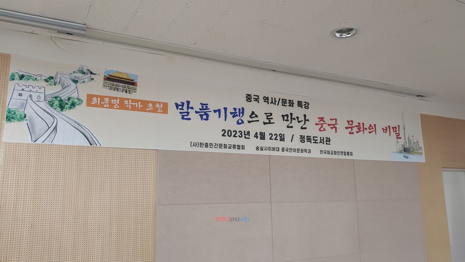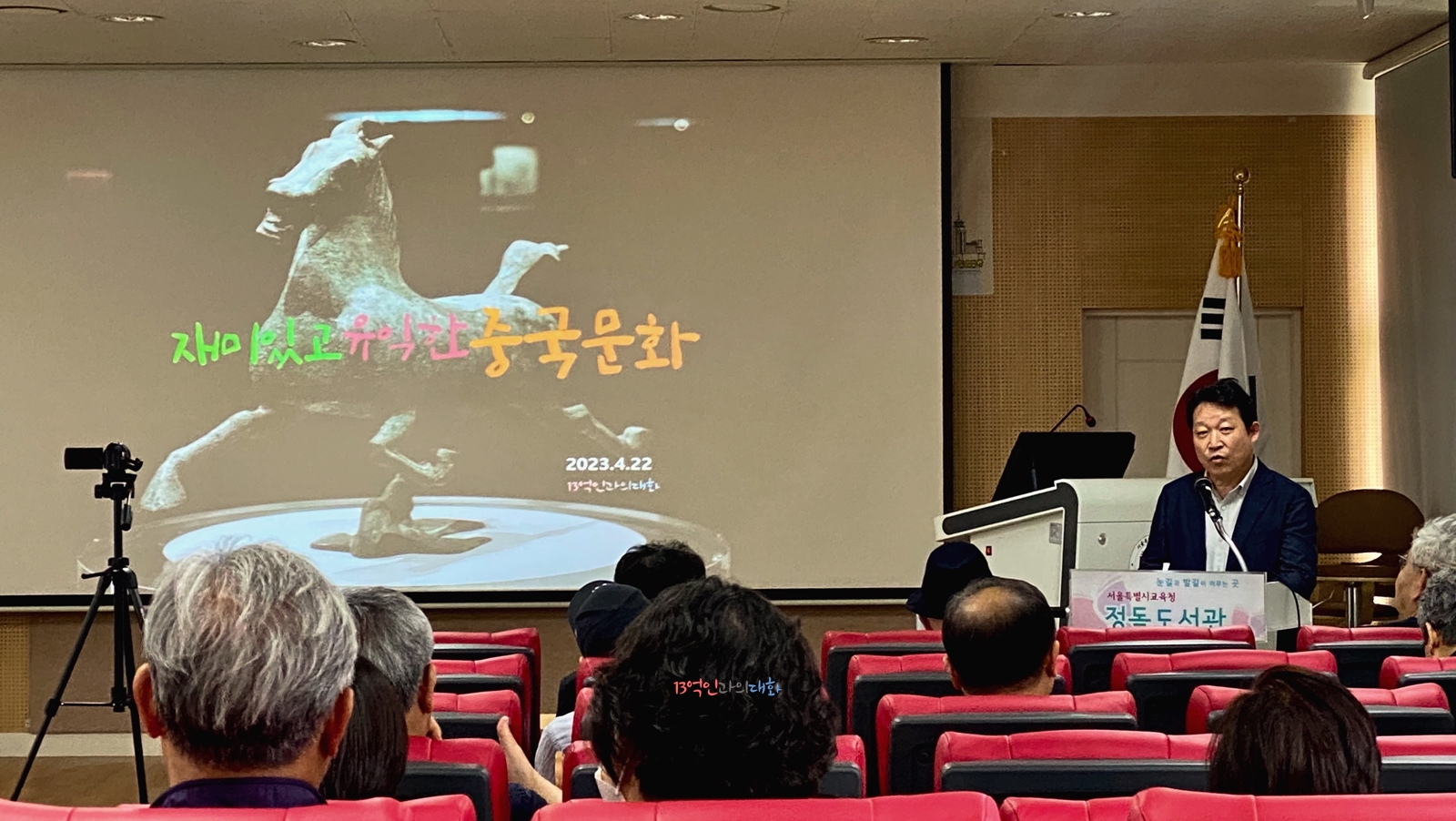 정독도서관에서 4월 22일(토) 오후 4시부터 2시간, "중국문화의 비밀"을 테마로 강의를 했습니다. (사)한중민간문화교류협회, 숭실사이버대학 중국언어문화학과, 한국화교화인연합총회가 공동으로 주최한 특강이었습니다. 60명이 넘는 분들이 참여해주셨습니다. 제 여행 함께 한 지인도 꽤 많이 오셔서 굉장히 반가웠습니다. 모두 감사합니다.