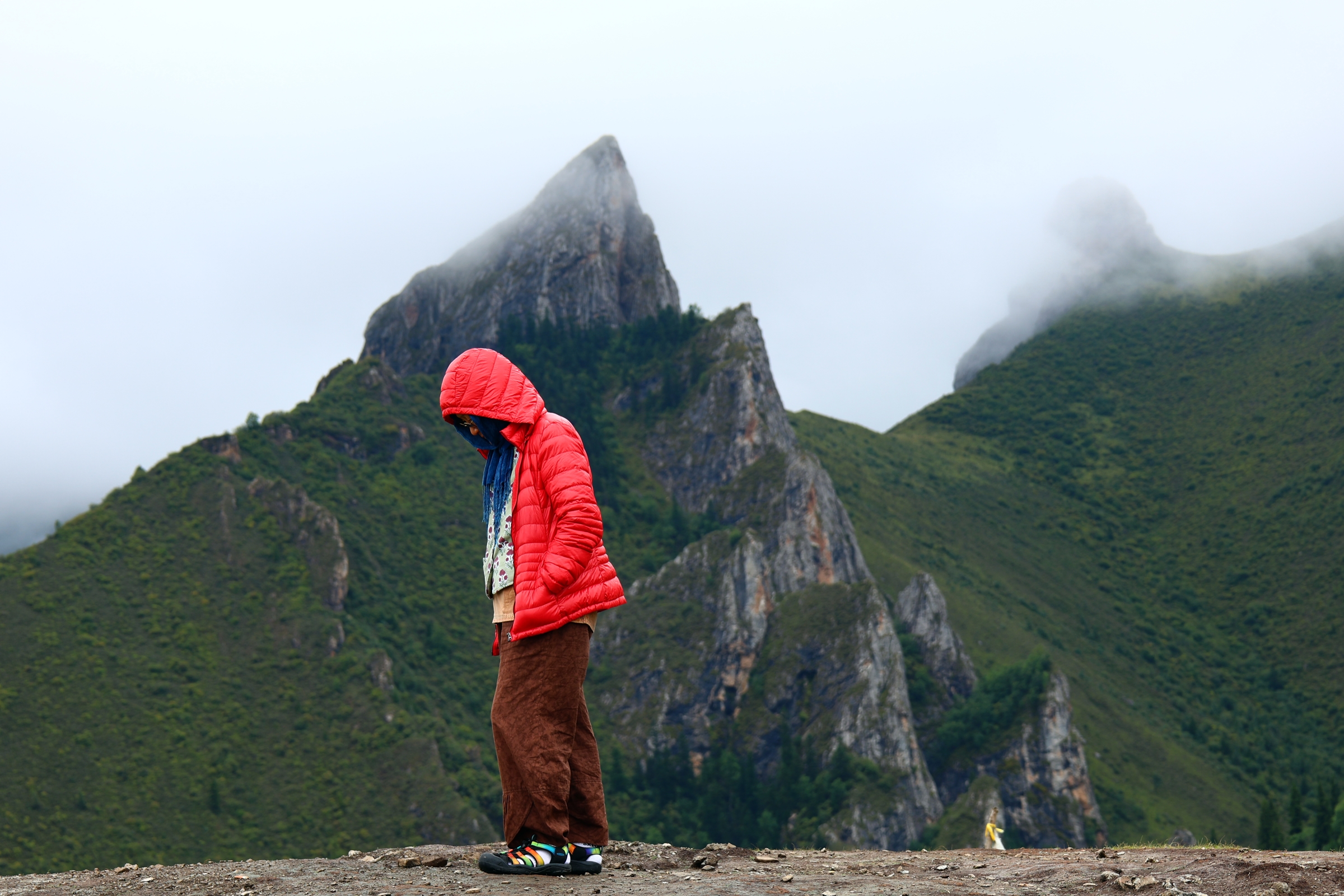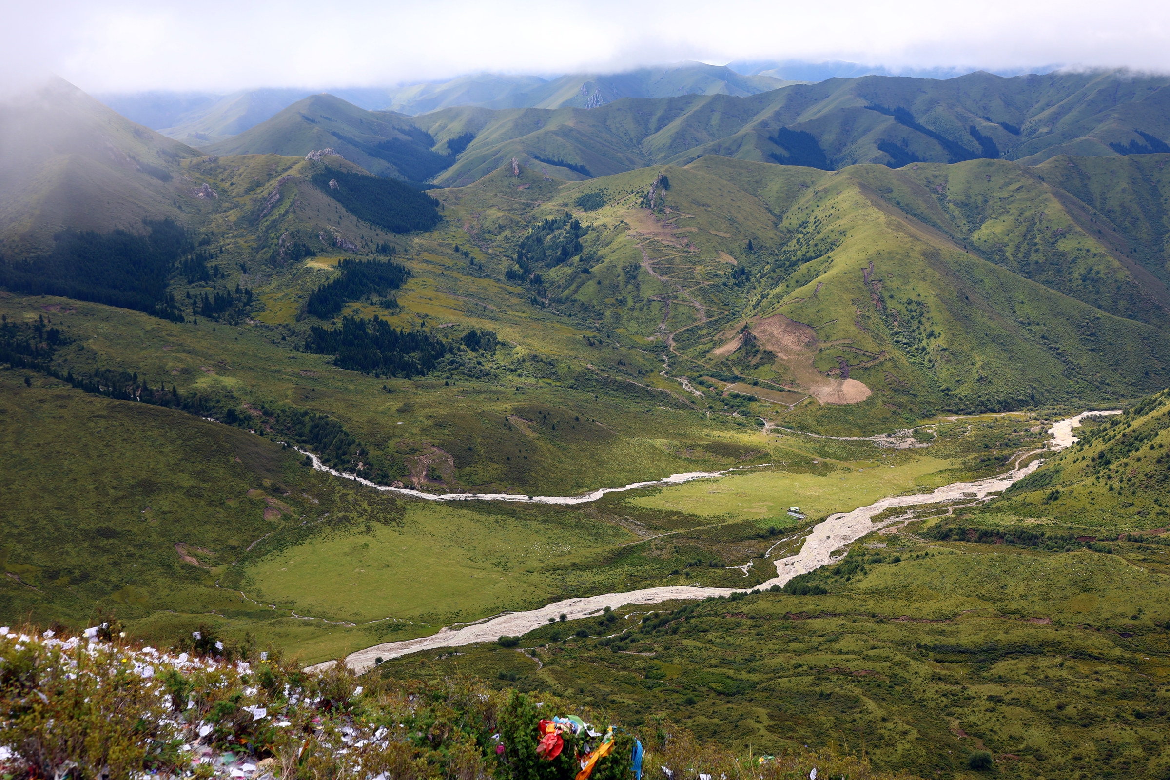 타르초와 룽따가 휘날리고 티베트 문양과 글자가 적힌 지전이 뿌려져 있는 고개다. 신성한 공간을 보여주듯 외상에서 나뭇가지가 타며 연기가 날아오른다.