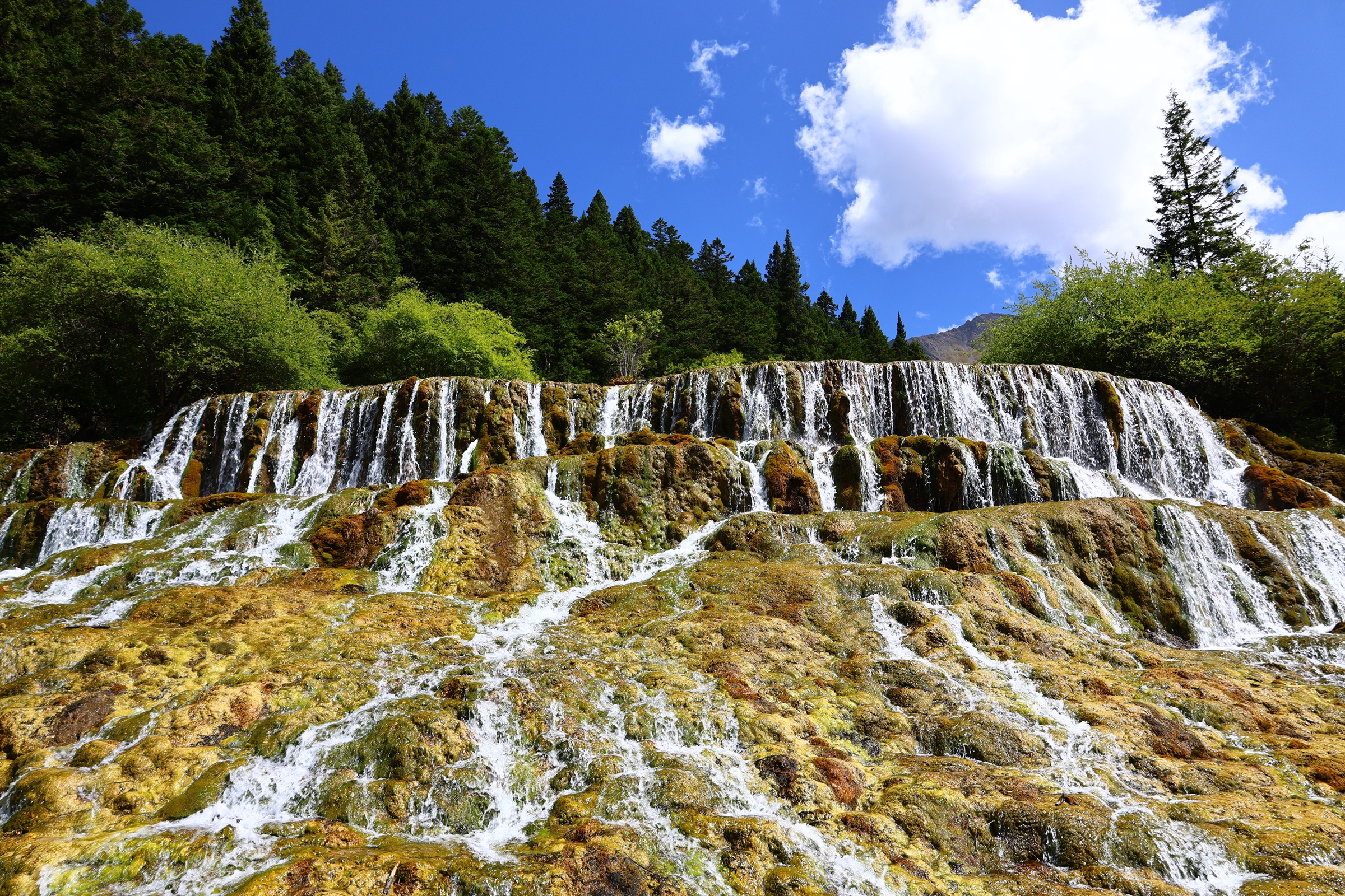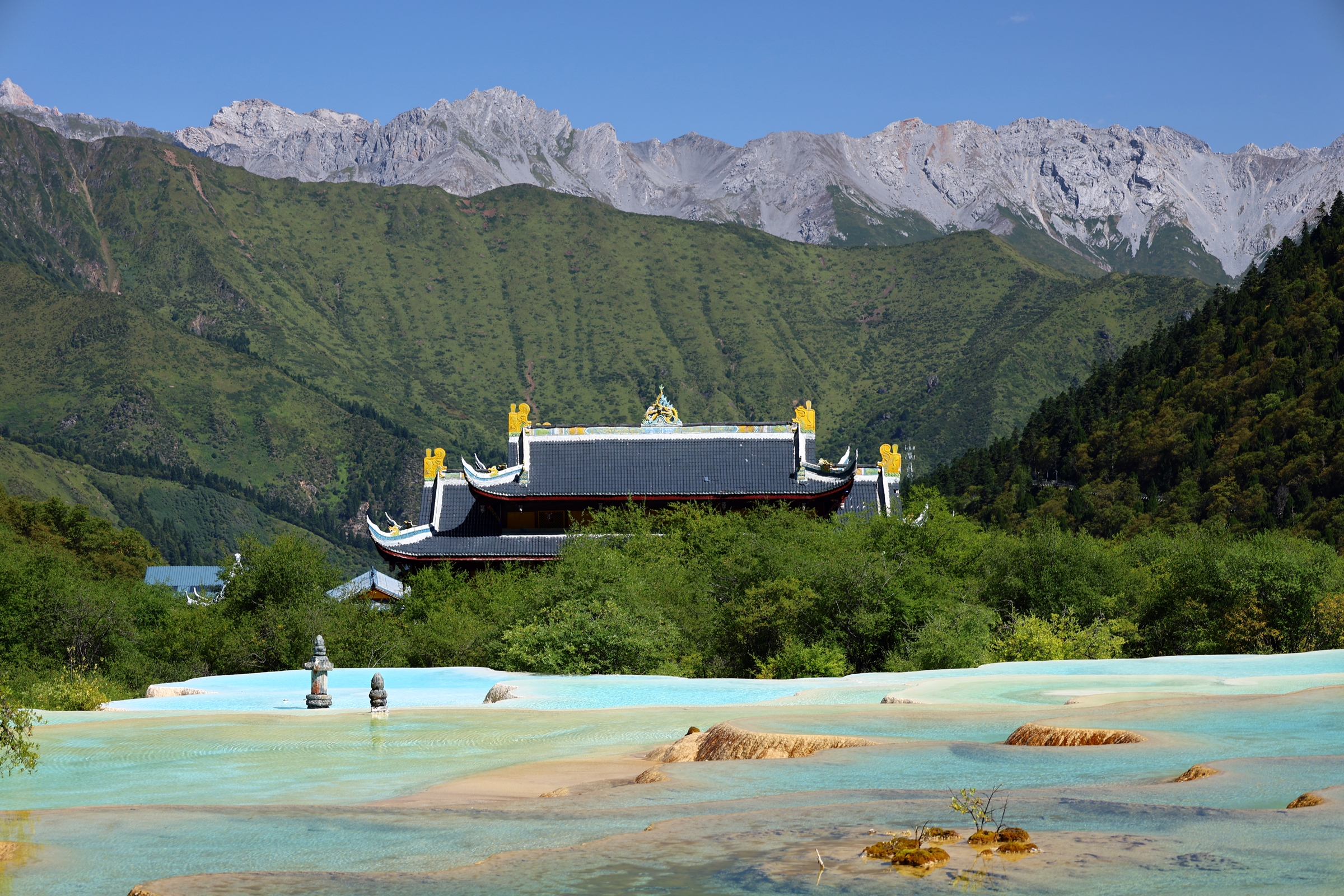 해발이 5,588m에 이르는 주봉 설보봉雪宝峰 아래 화려한 연못과 설산, 협곡과 삼림이 우거진 천혜의 땅. 황룡구黄龙沟로 진입해 케이블카 타고 내린 후 약 20분 가량 천천히 계단을 올라가 오채지五彩池 보고 하산하며 차례로 관람한다. 유네스코 세계자연유산이다.