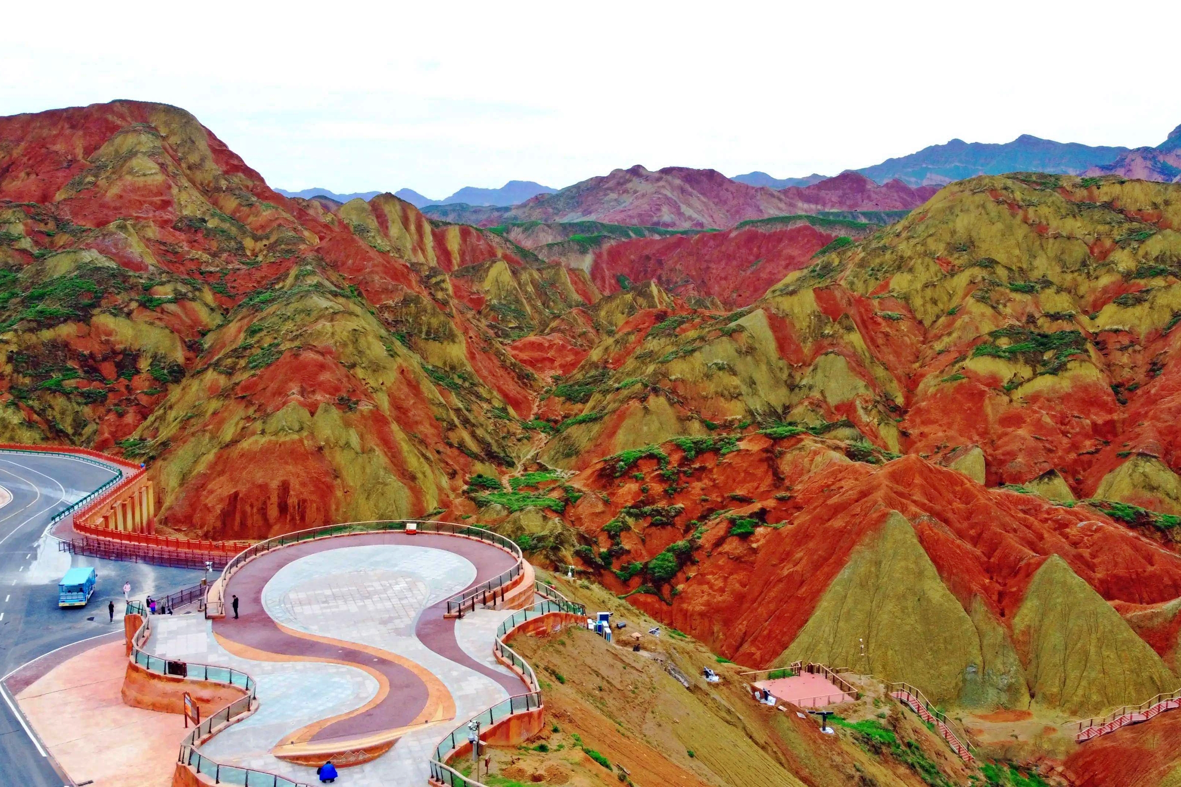 붉은 산과 푸른 초원이 어울리고 홍사암红砂岩 지질 풍광을 감상한다. 316번 국도의 뱀처럼 휘감기는 모양도 보게 된다.